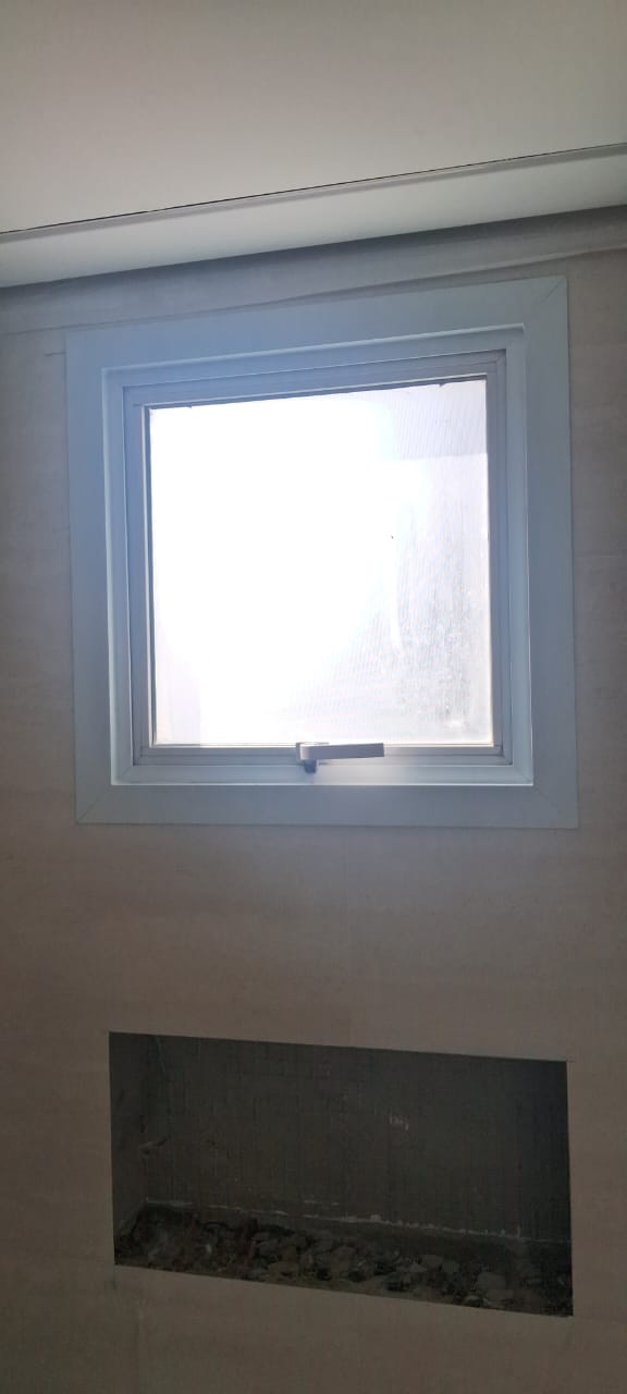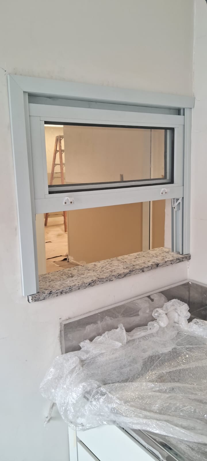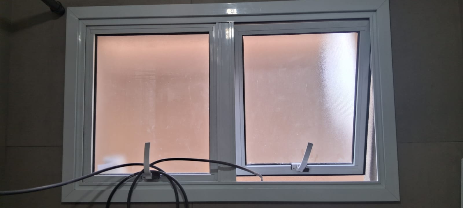 Janela tipo maxi ar com persianas entre vidros tipo hospitalar.